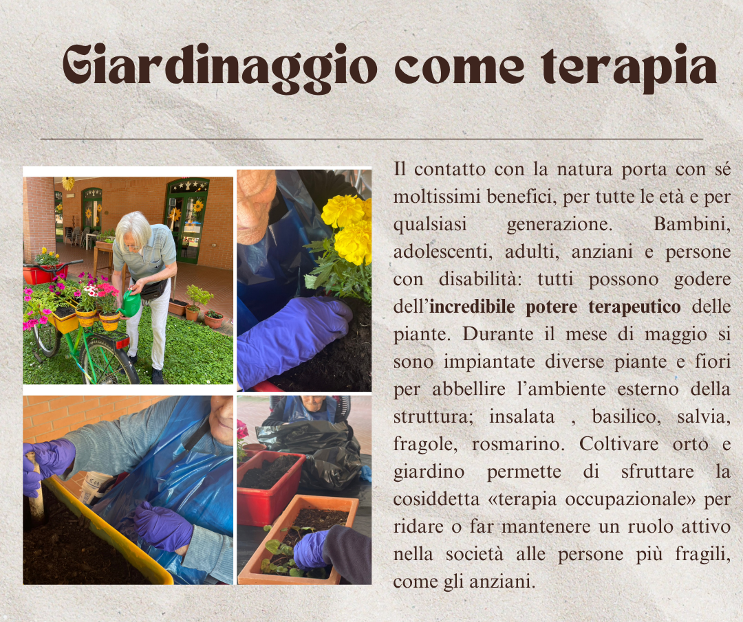 Durante il mese di maggio gli anziani del Felice Carri di Gualtieri si sono dedicati al giardinaggio, attraverso la cura dell'orto e la coltivazione di piantine. Il contatto con la natura genera numerosi effetti terapeutici positivi: permette agli anziani di rafforzare il senso di comunità, i legami sociali e soprattutto aiuta a stimolare la mente.