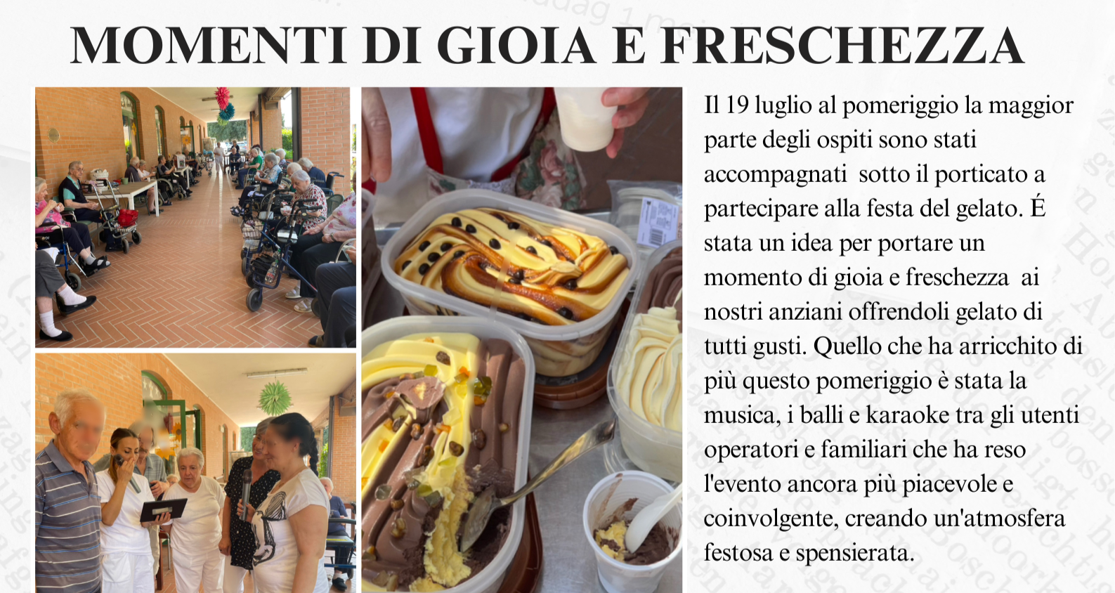 Pomeriggio gioioso trascorso all'aria aperta al Felice Carri di Gualtieri in occasione della Festa del Gelato. Anziani, familiari e operatori tutti riuniti a gustarsi un buon gelato con musica, balli e karaoke, in un'atmosfera spensierata.