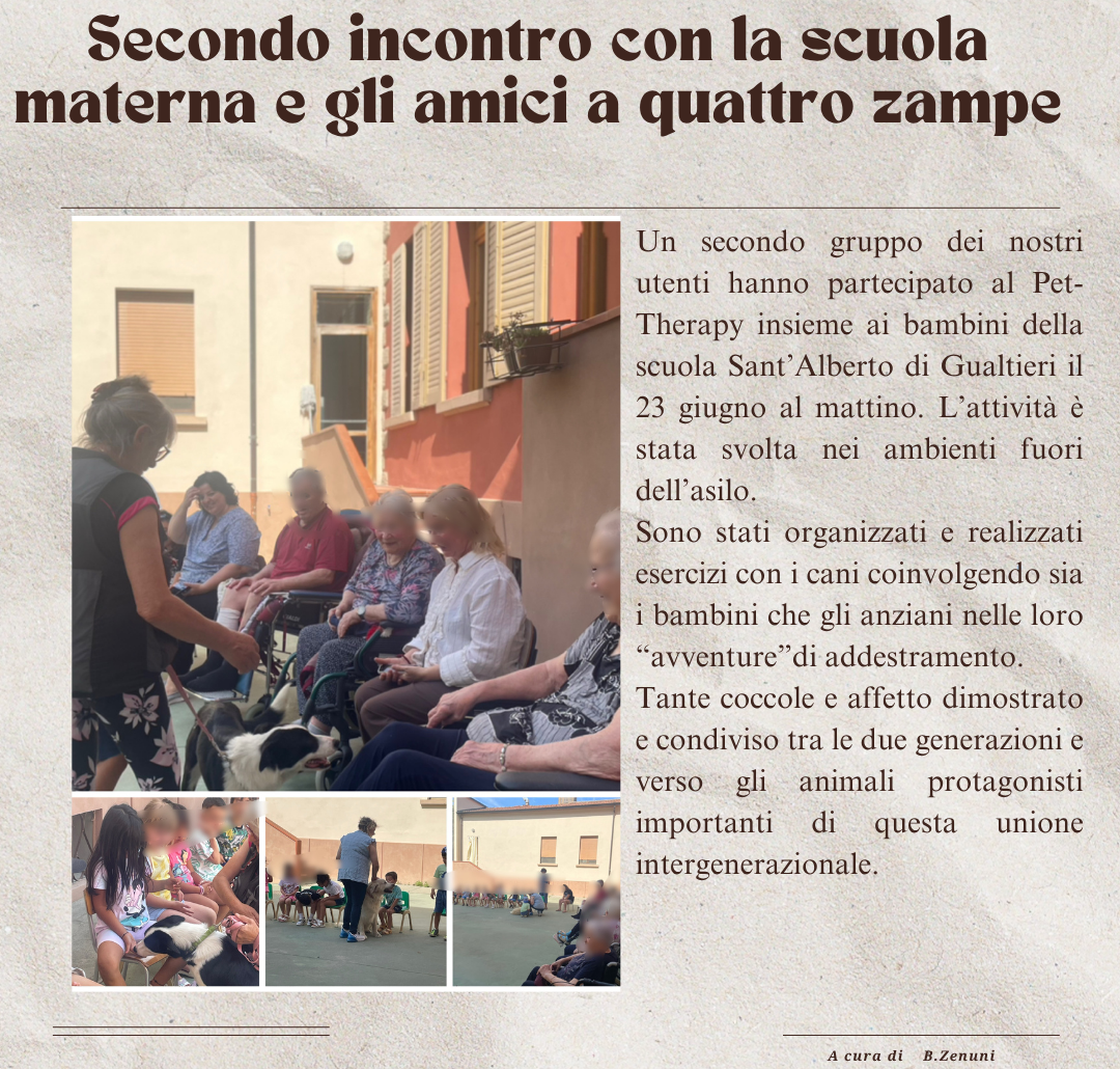 Il 23 giugno, in una splendida mattinata all’aperto, gli anziani del Felice Carri di Gualtieri hanno vissuto un’esperienza speciale: la Pet-Therapy insieme ai bambini della scuola Sant’Alberto di Gualtieri. In un clima di allegria e tenerezza, grandi e piccoli si sono incontrati per condividere sorrisi, carezze e momenti unici, accompagnati dai loro amici a quattro zampe.