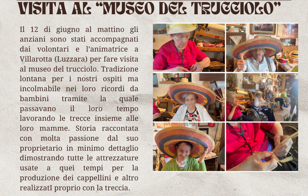 Gli anziani del Felice Carri di Gualtieri hanno visitato il Museo del Trucciolo a Villarotta (Luzzara). Un’esperienza toccante che ha risvegliato dolci ricordi d’infanzia, quando intrecciavano le trecce con le loro mamme. Il proprietario del museo ha raccontato con passione la storia e gli strumenti usati per creare cappellini e oggetti intrecciati, riportando tutti indietro nel tempo, tra emozioni e sorrisi.