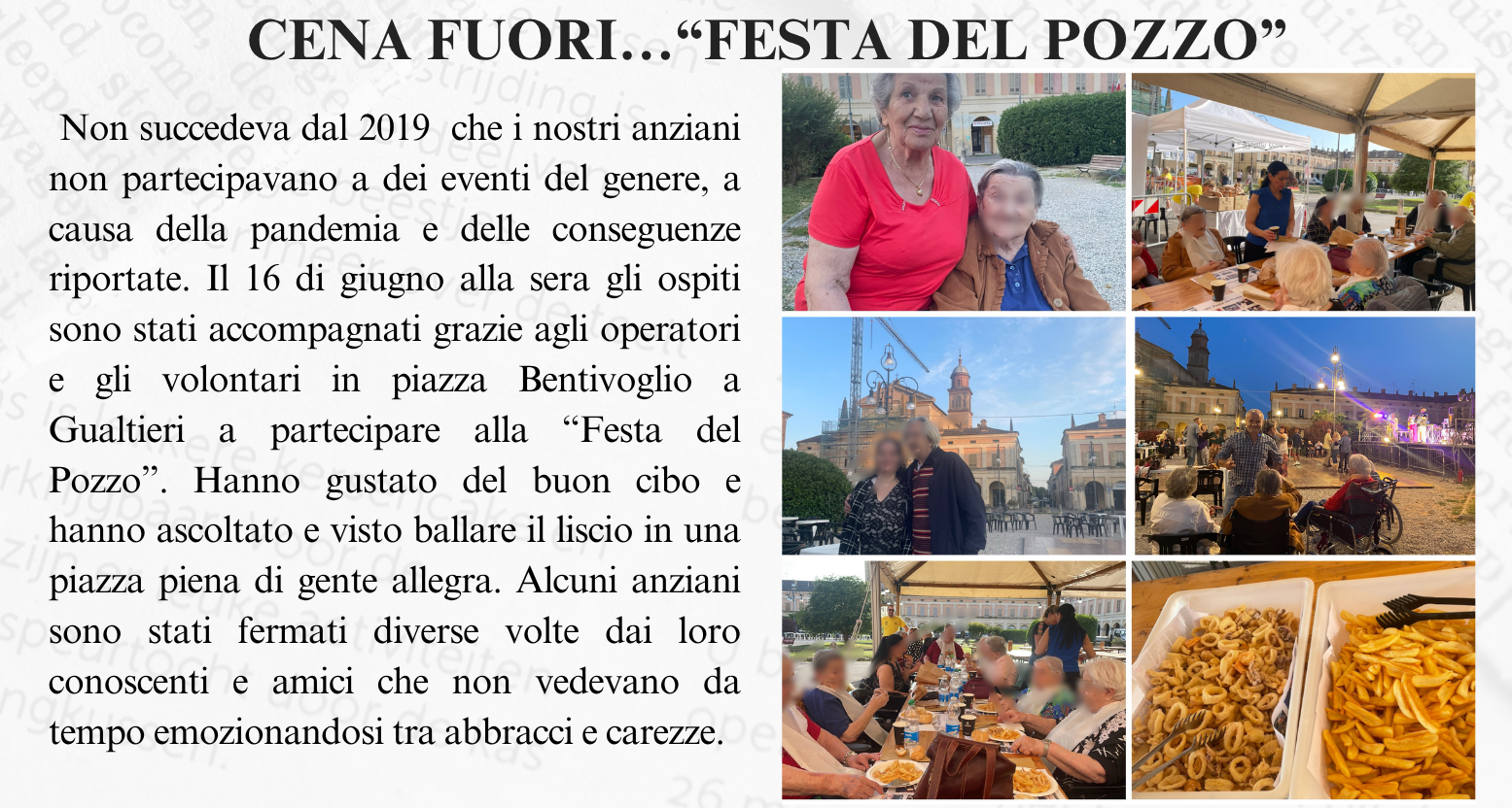 Dopo tanti anni di attesa, finalmente i nostri anziani hanno potuto tornare a vivere una serata speciale all’aperto, come non accadeva dal 2019: grazie all’impegno degli operatori e dei volontari, sono stati accompagnati in piazza Bentivoglio a Gualtieri per partecipare alla “Festa del Pozzo”. È stata una serata ricca di sorrisi, incontri e tanta emozione. Tra un piatto di buon cibo e la musica del liscio, la piazza si è riempita di allegria.