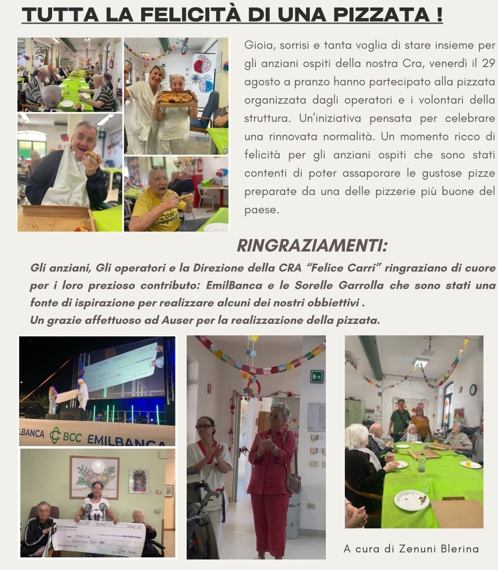 Venerdì 29 agosto il Felice Carri si è riempito di sorrisi, profumo di pizza e calore umano. I nostri anziani hanno vissuto un momento di vera gioia, gustando insieme una pizzata speciale organizzata con amore da operatori e volontari. E' stato molto più di un pranzo: è stato un abbraccio collettivo, un assaggio di normalità e affetto condiviso. Un grazie di cuore a chi ha reso possibile questa giornata così semplice eppure così preziosa.