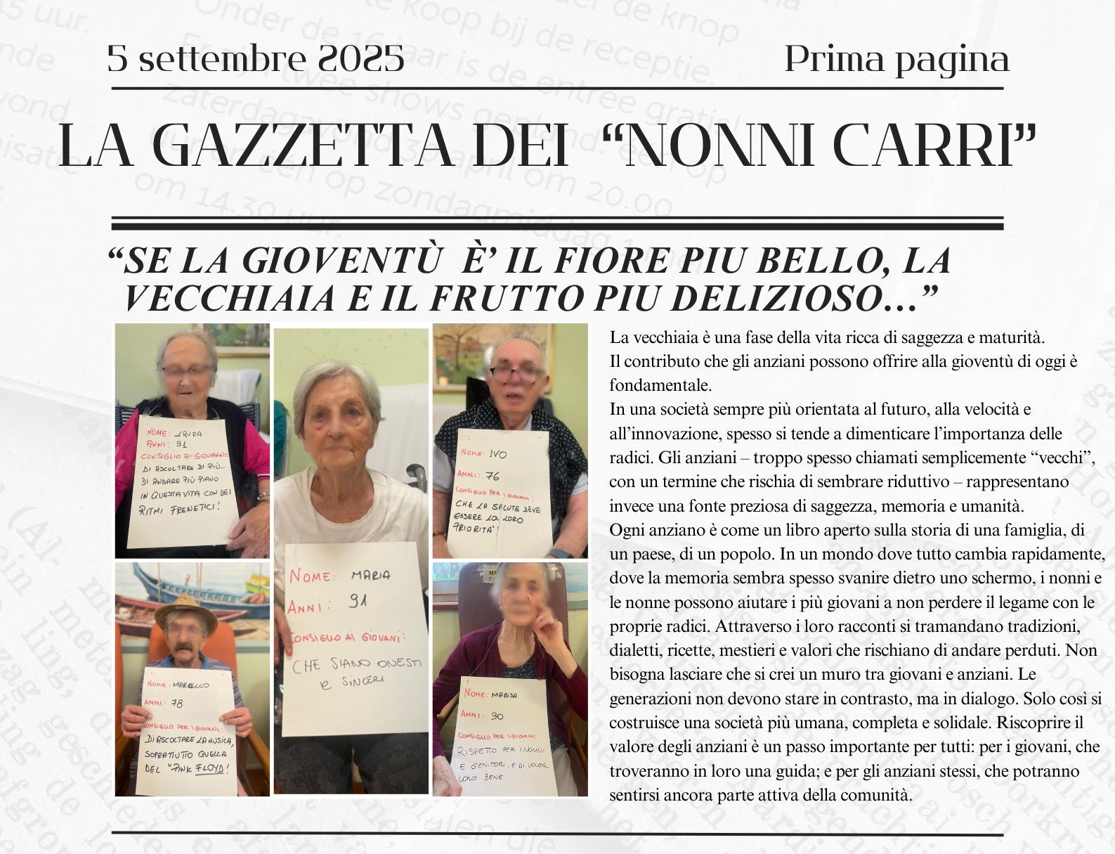 Gli anziani sono custodi di saggezza, radici e insegnamenti. In un mondo che corre veloce, ci aiutano a rallentare, a ricordare chi siamo e da dove veniamo. Ascoltarli non è solo un atto di rispetto, ma un modo per riscoprire valori autentici e costruire legami tra le generazioni. Solo insieme, giovani e anziani, possiamo dare vita a una comunità più ricca, unita e profondamente umana.