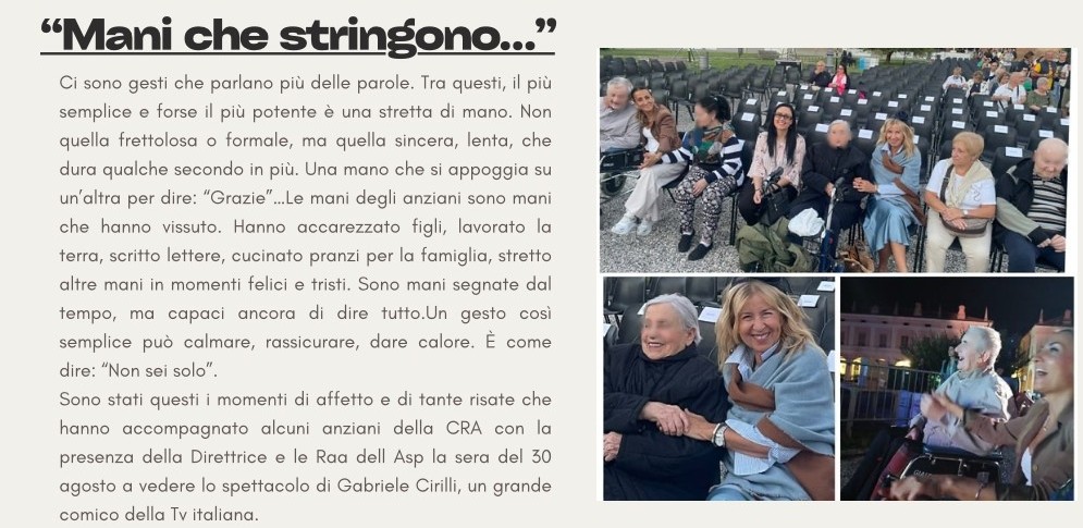 Ci sono gesti che parlano direttamente al cuore, come una stretta di mano sincera e lenta, capace di dire ''Grazie'' e ''Non sei solo''. Le mani degli anziani portano con sé una storia di amore, fatica e dedizione e ancora oggi sanno donare calore e conforto. La serata del 30 agosto, insieme al Direttore e alle RAA di ASP, è stato un momento prezioso di allegria e vicinanza, grazie allo spettacolo di Gabriele Cirilli, che ha regalato sorrisi e affetto a tutti.