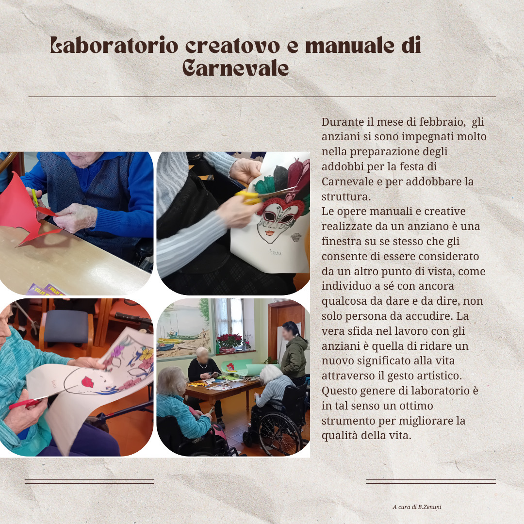 Durante il mese di febbraio, gli anziani si sono impegnati nella preparazione degli addobbi per la festa di Carnevale e per addobbare la struttura. Questo genere di laboratorio è un ottimo strumento per migliorare la loro qualità di vita.