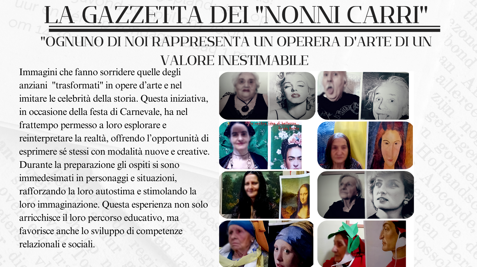 In occasione della festa di Carnevale al Felice Carri di Gualtieri gli anziani ospiti della struttura si sono divertiti a ''trasformarsi'' in opere d'arte e nel imitare le celebrità della storia. Questa esperienza gli ha permesso di esprimere la loro immaginazione.