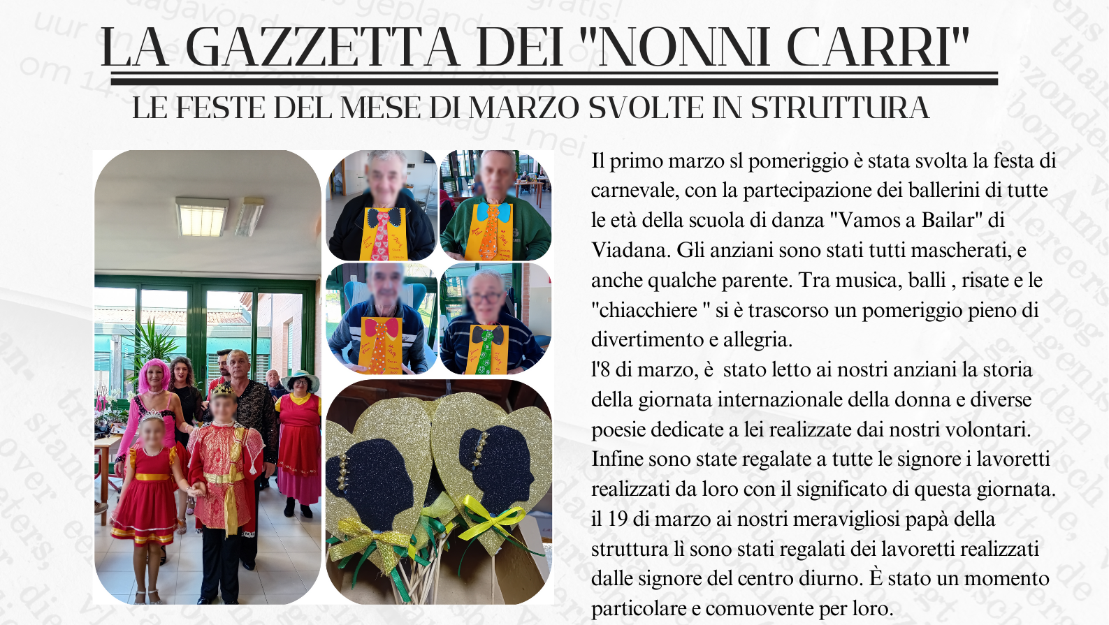 Al Felice Carri di Gualtieri si sono svolte numerose feste durante il mese di Marzo tra cui a Festa di Carnevale con tanto di balli insieme ai ballerini della scuola di danza ''Vamos a Bailar'', la Festa della Donna durante la quale c'è stata la lettura di poesie realizzate dai volontari e infine la Festa del Papà, i quali hanno ricevuto dei lavoretti realizzati dalle signore del centro diurno.