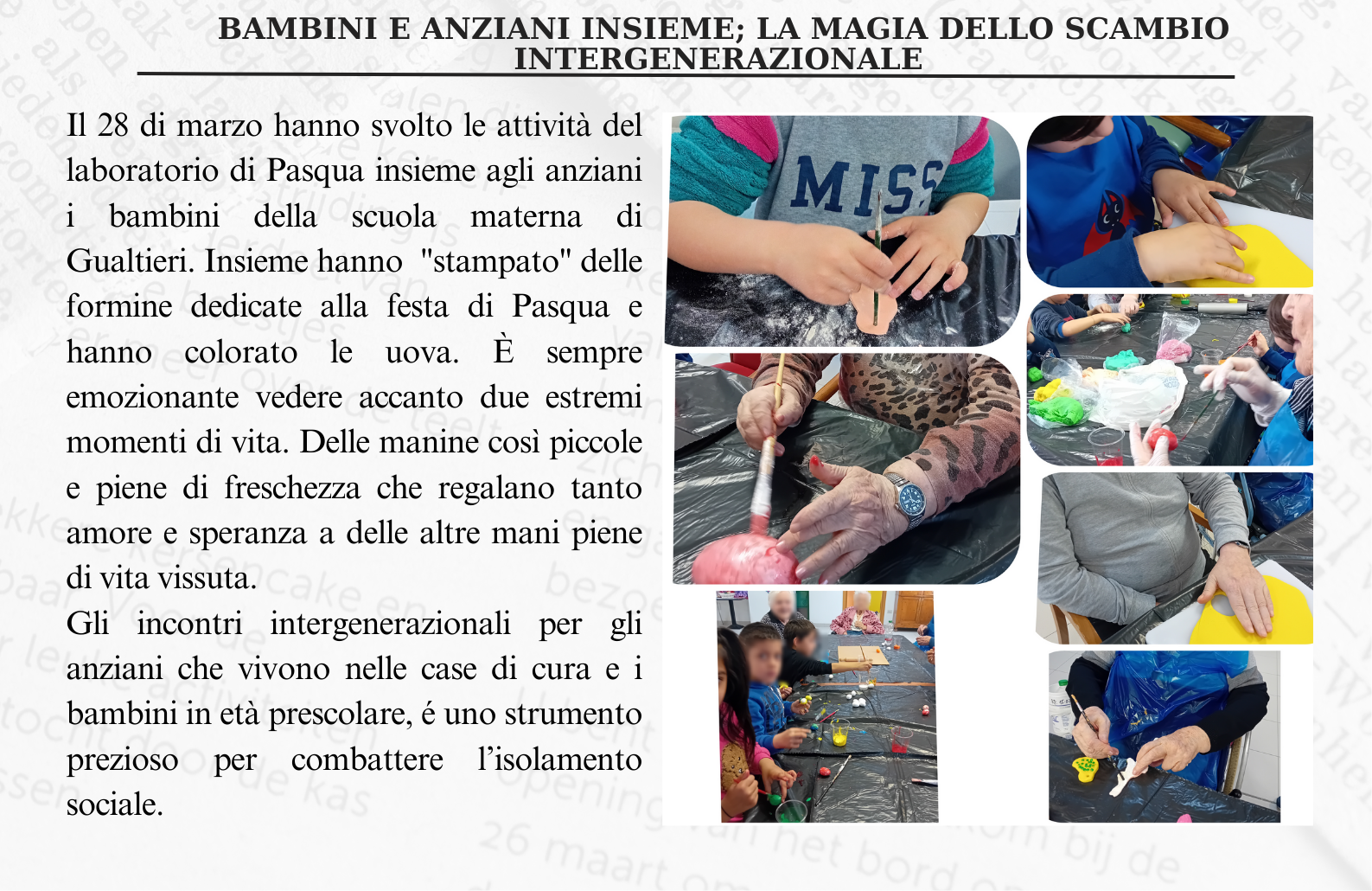 Il 28 marzo al Felice Carri di Gualtieri si è svolto il Laboratorio di Pasqua che è stata un'occasione per anziani e bambini di trascorrere una giornata insieme a creare formine pasquali e a dipingere. Questi momenti riempiono di amore e di gioia oltre che a strappare sorrisi.