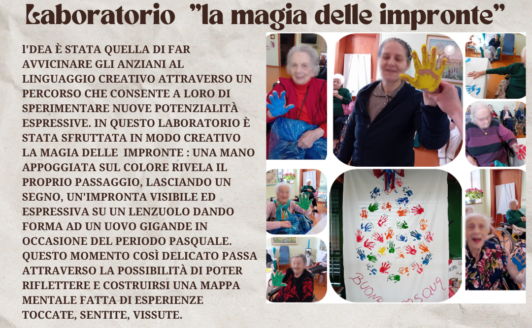 Al Felice Carri di Gualtieri è stato svolto il Laboratorio ''La magia delle Impronte'' al fine di far sperimentare agli anziani nuove potenzialità espressive. Lasciando le loro impronte colorate sul lenzuolo hanno dato forma a un gigante uovo di Pasqua e allo stesso tempo hanno lasciato una traccia indelebile.