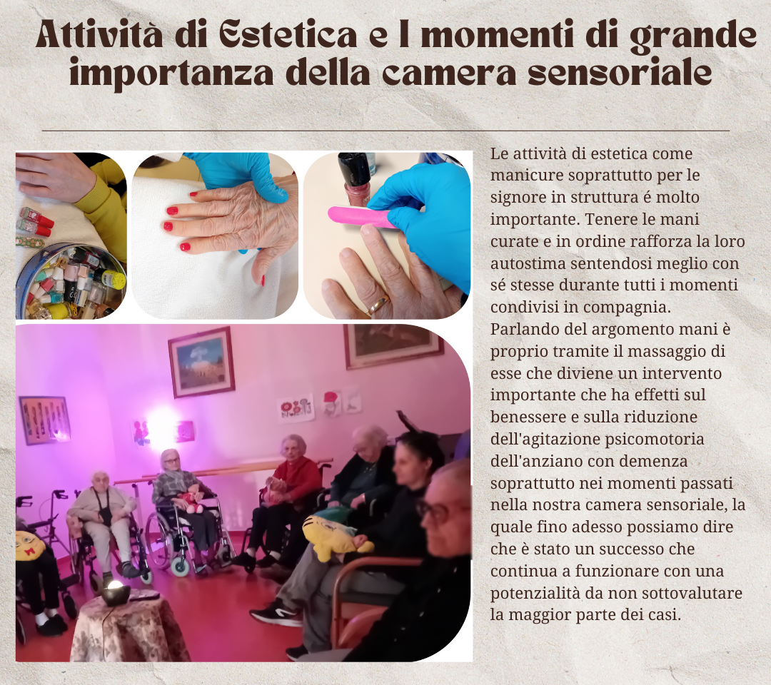Al Felice Carri sono state svolte attività di estetica come la manicure. Tenere le mani curate e in ordine rafforza l'autostima delle signore, aiutandole a sentirsi meglio con se stesse. Inoltre la manicure ha un ulteriore effetto benefico: aiuta a ridurre l'agitazione psicomotoria degli anziani con demenza.