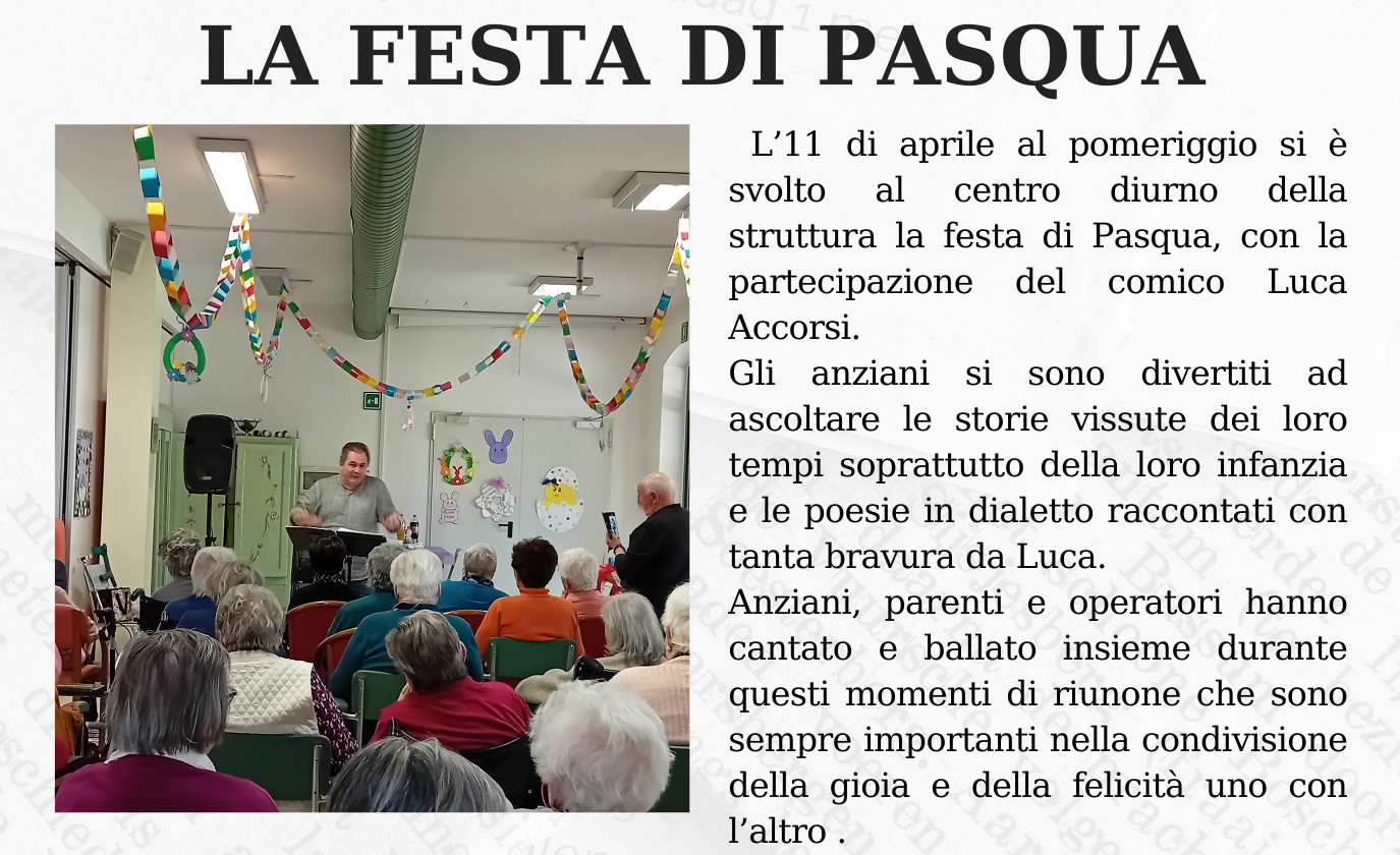 Al Felice Carri di Gualtieri l'11 di aprile si è svolta la Festa di Pasqua con la partecipazione del comico Luca Accorsi che ha rallegrato gli anziani raccontando poesie in dialetto. E' stato un momento di particolare gioia e felicità condivisa.