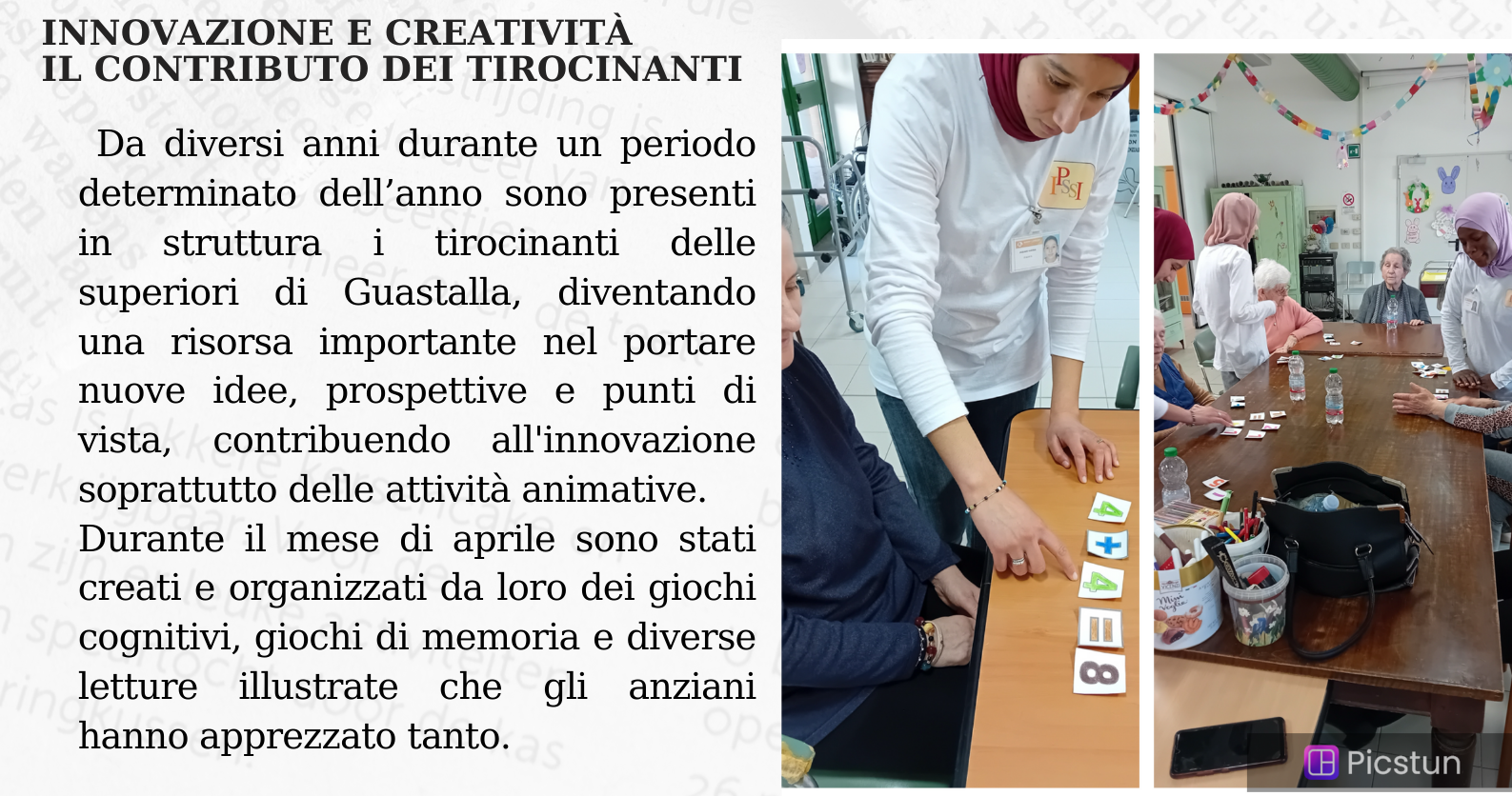 Da diversi anni al Felice Carri durante determinati periodi sono presenti i tirocinanti delle scuole superiori di Guastalla i quali rappresentano un'importante risorsa nel portare nuove idee, punti di riflessione e innovazione soprattutto nelle attività animative.