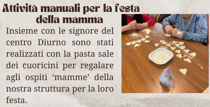 Al Felice Carri insieme alle signore del centro Diurno sono stati realizzati a mano dei cuoricini da regalare alle mamme della struttura in occasione della Festa della Mamma.