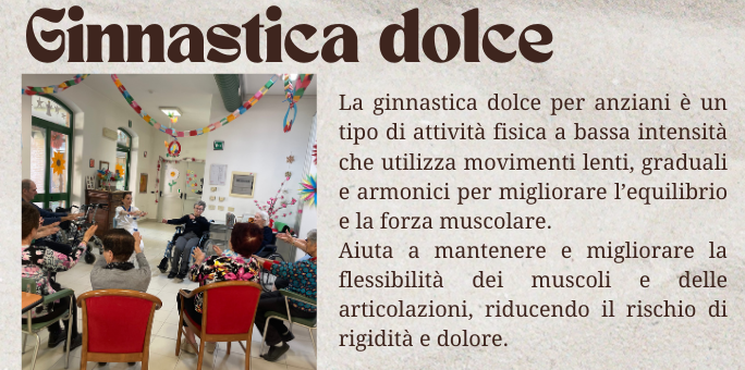 Al Felice Carri di Gualtieri gli anziani svolgono la ginnastica dolce che consiste in un'attività a bassa intensità che ha numerosi benefici come migliorare la flessibilità, la forza muscolare e l'equilibrio, oltre a favorire la socializzazione.